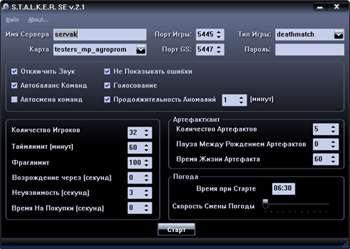 С помощью этой программы можно легко создать свой сервер. Инструкция: 1. Скачиваем программу 2. Перемещаем скаченую программу в папку bin (эта папка должна быть в папке с установленной игрой Сталкер) 3. Открываем и делаем настройки. 4. Жмём создать 5. Всё, готово! [size=16][b][i][u][color=orange]Внимание работает только в ТЧ 1.1 - 1.6 Stalker Server